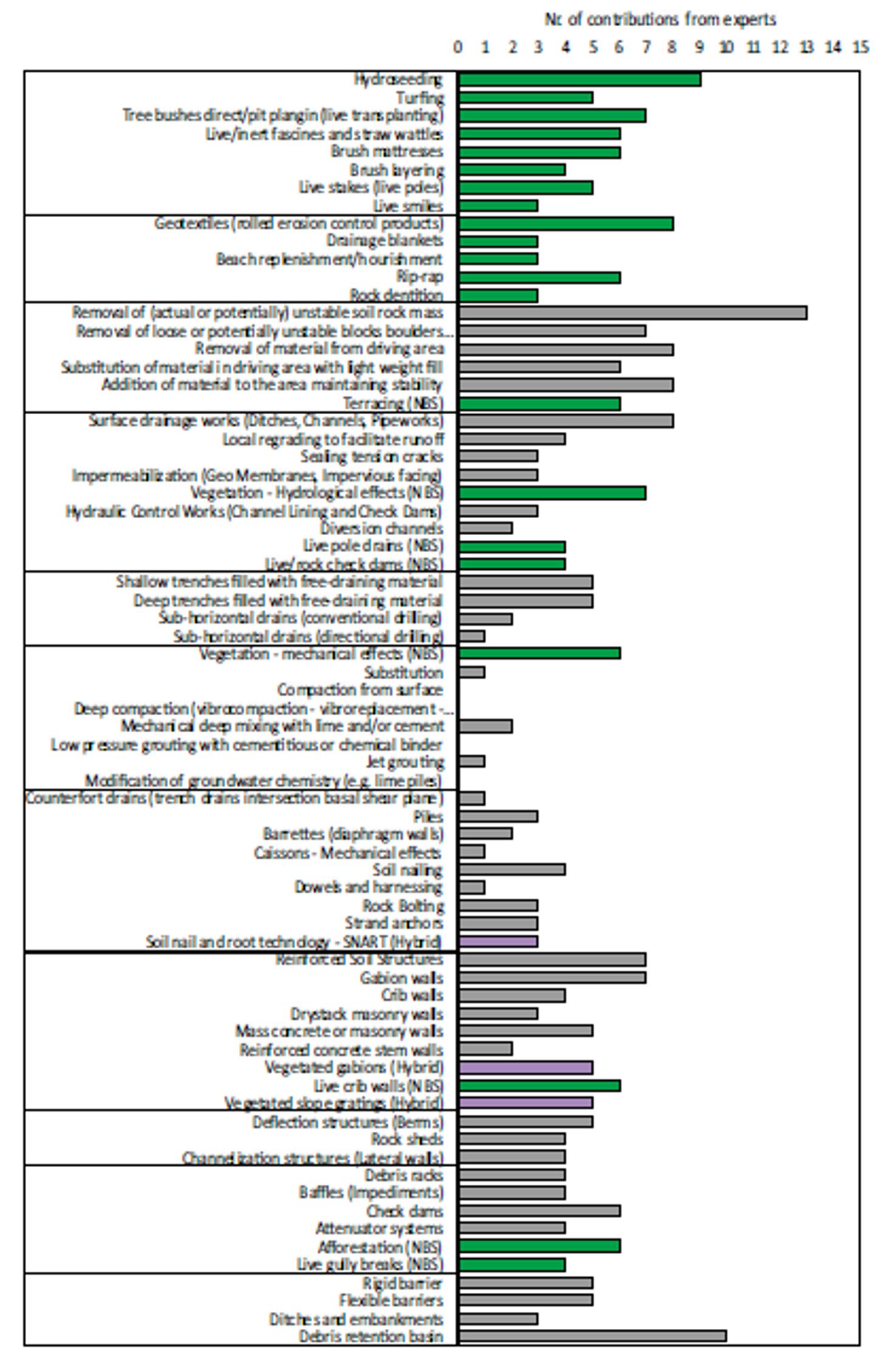 Overview of number of responses for each mitigation measure (grey colour — traditional engineering measures, violet — hybrid measures, green — NBS and soil bioengineering)