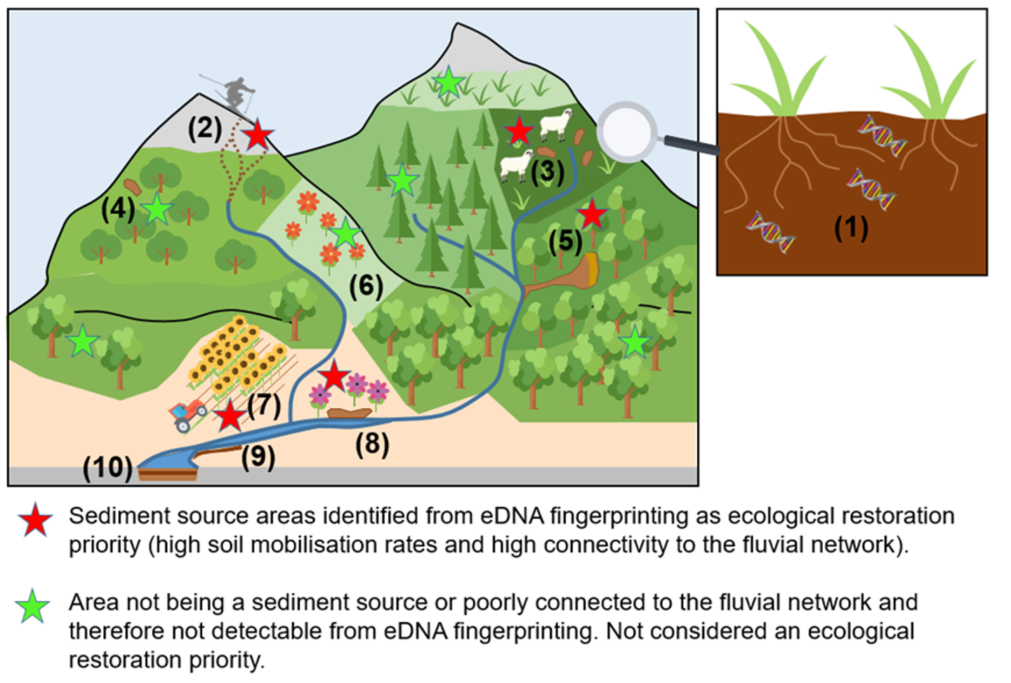 High mountain environments are often exposed to severe weather events that generate extreme runoff, making soil erosion severe. The urgent need to mitigate severe water erosion and landsliding, especially in the current context of a changing climate and biodiversity loss, calls for an improved understanding of nature-based solutions and their efficacy in restoring disturbed landscapes. The restoration of slope stability with vegetation is, however, far from straightforward. The use of sediment source fingerprinting based on eDNA would allow the investigation of complex and often poorly understood relationships between vegetation cover, restoration activities, and geomorphological response at the catchment scale. Furthermore, it could be used to monitor restoration programs, and therefore, improve the success rates of restoration activities. The scope of applications is not limited to the identification of present-day sediment sources, but can be expanded to investigations of Human-Environment interactions over longer times scales (for example, when applied to lake sediments).